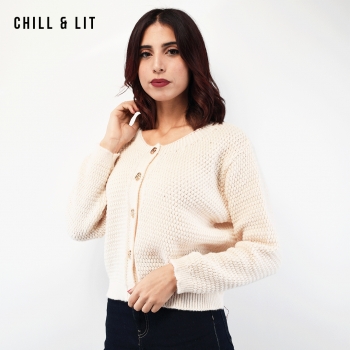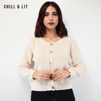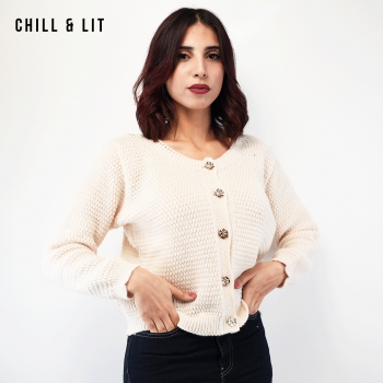 Gilet en Laine pour Femme, avec Manches Longues et Boutons en Forme de Coquillage en Acier Inoxydable. Hyper Tendance Cet Hiver . Mannequin Porte La Taille Standard.