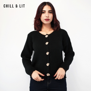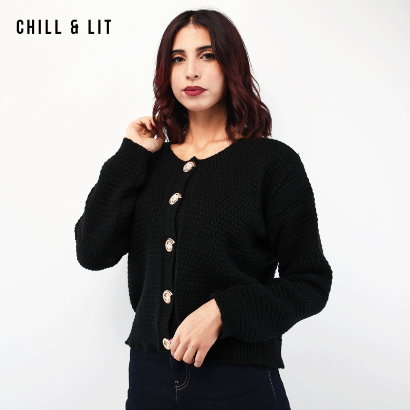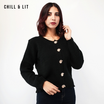 Gilet en Laine pour Femme, avec Manches Longues et Boutons en Forme de Coquillage en Acier Inoxydable. Hyper Tendance Cet Hiver . Mannequin Porte La Taille Standard.