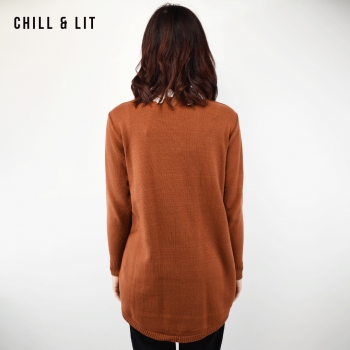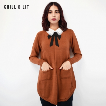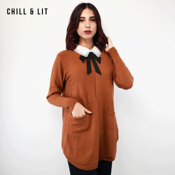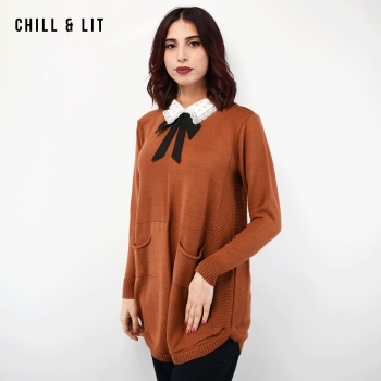 Pull Long en Laine pour Femme, Avec Manches Longues, 2 Poches à L'avant et Col chemise à Strass . Hyper Tendances . Le Mannequin Porte La Taille Standard. Mannequin Mesure 1.78m.