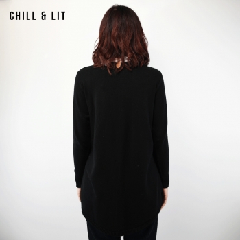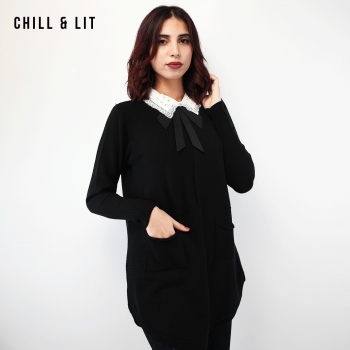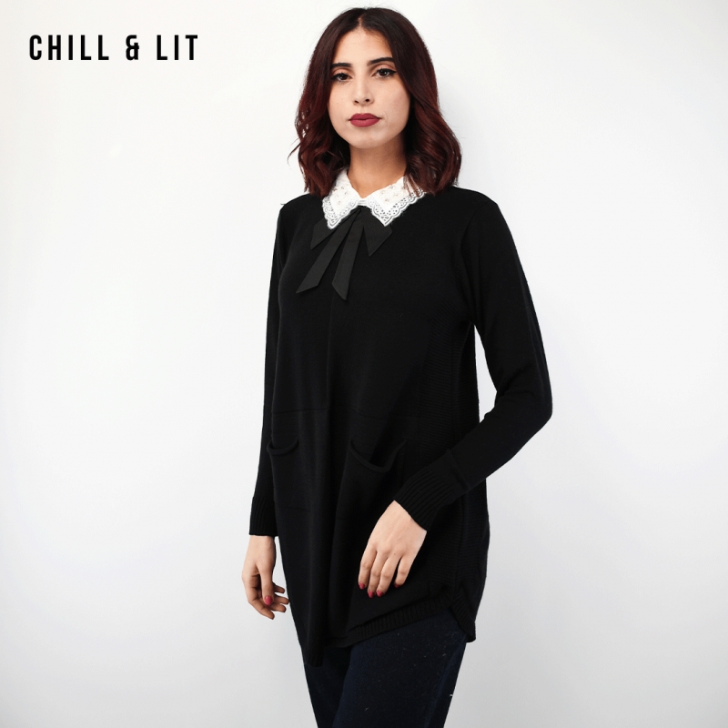 Pull Long en Laine pour Femme, Avec Manches Longues, 2 Poches à L'avant et Col chemise à Strass . Hyper Tendances . Le Mannequin Porte La Taille Standard. Mannequin Mesure 1.78m.