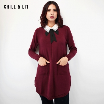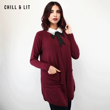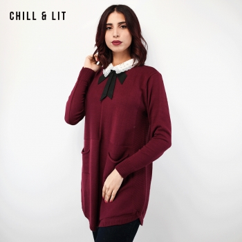 Pull Long en Laine pour Femme, Avec Manches Longues, 2 Poches à L'avant et Col chemise à Strass . Hyper Tendances . Le Mannequin Porte La Taille Standard. Mannequin Mesure 1.78m.