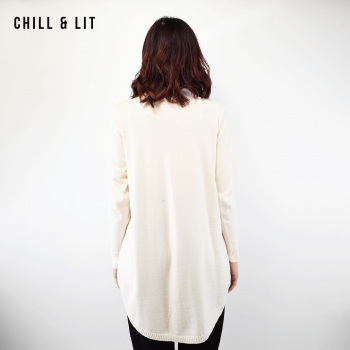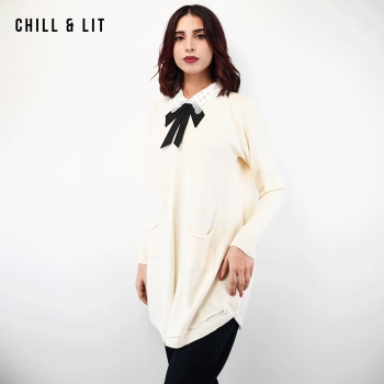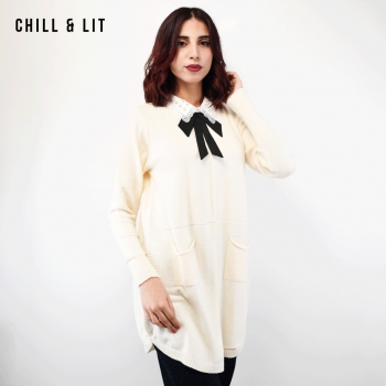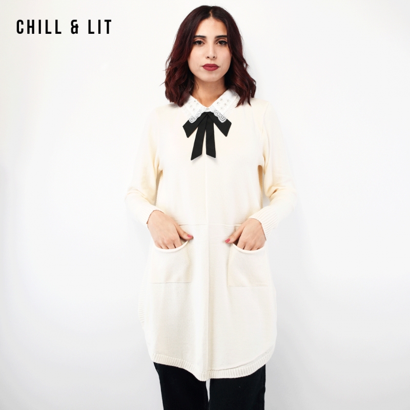 Pull Long en Laine pour Femme, Avec Manches Longues, 2 Poches à L'avant et Col chemise à Strass . Hyper Tendances . Le Mannequin Porte La Taille Standard. Mannequin Mesure 1.78m.