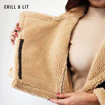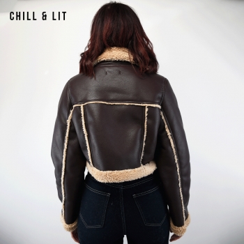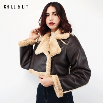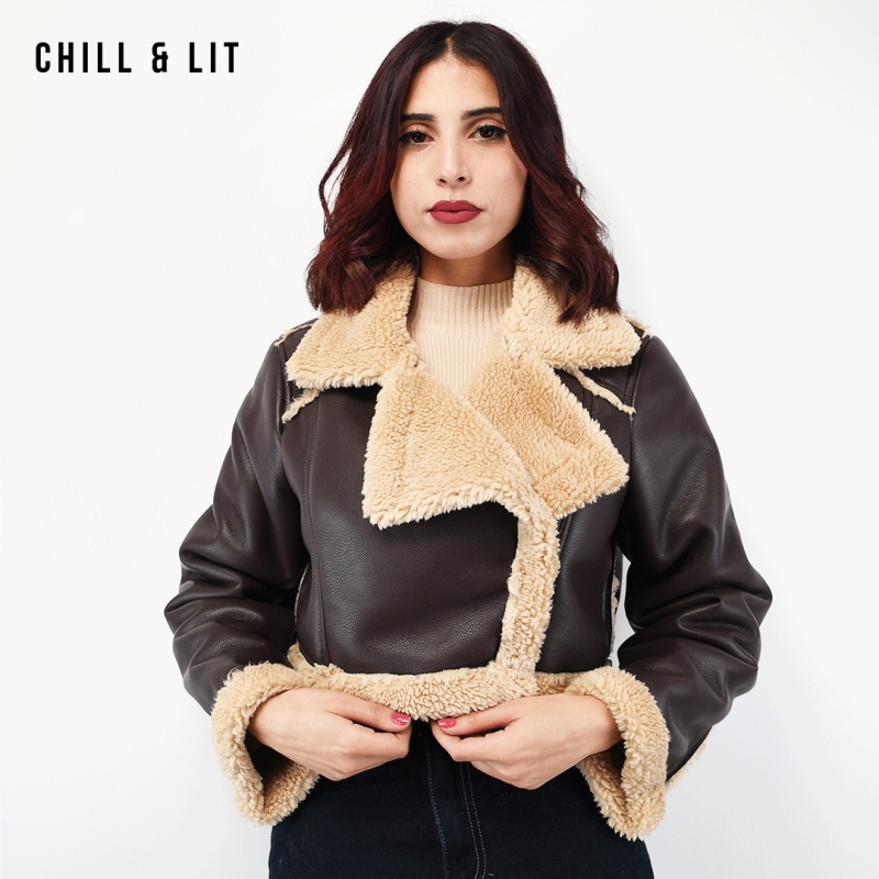 Veste en Cuir Courte Femme avec Doublure ,Fermeture Glissière, et Col en Fausse Forure Hyper Tendance cet Hiver. Le Mannequin Porte La Taille S et Mesure 1m78.