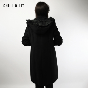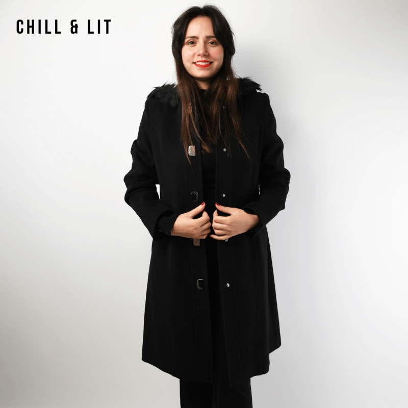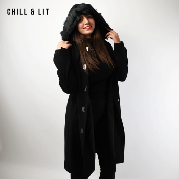 Manteau Cachemire avec Capuche pour Femme avec 2 Poches, Fermeture à Boutons. Hyper Tendance cet Hiver. Le Mannequin Porte La Taille 42 et Mesure 1m78.
