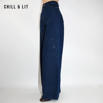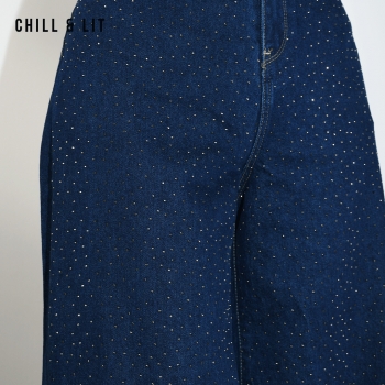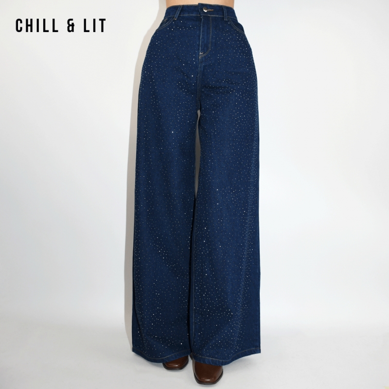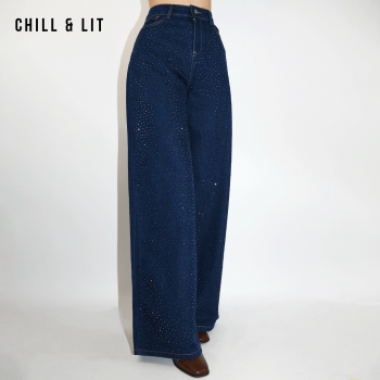 Pantalon Jean Femme Coupe Large avec strass, Taille Haute. Super Tendance en ce Moment. Le mannequin porte la taille 38. Le Mannequin Mesure:1m75.