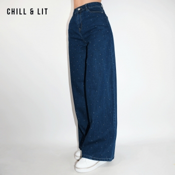 Pantalon Jean Femme Coupe Large avec Strass, Taille Haute. Super Tendance en ce Moment. Le mannequin porte la taille 36. Le Mannequin Mesure:1m75