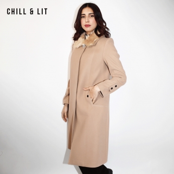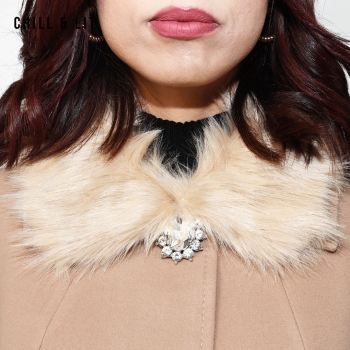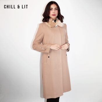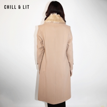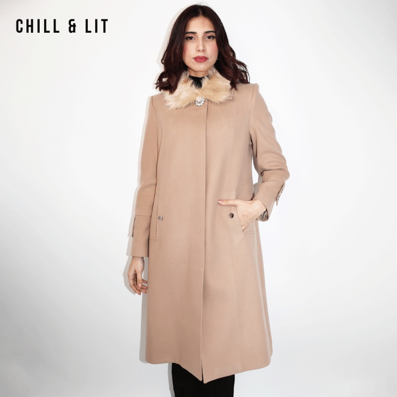 Manteau en Cachemire avec Col en Fourrure Amovible et une Broche pour Femme avec deux poches, Fermeture à Boutons. Hyper Tendance cet Hiver. Le Mannequin Porte La Taille 42 et Mesure 1m78.;