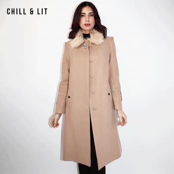 Manteau en Cachemire avec Col en Fourrure Amovible et une Broche pour Femme avec deux poches, Fermeture à Boutons. Hyper Tendance cet Hiver. Le Mannequin Porte La Taille 42 et Mesure 1m78.
