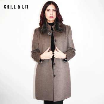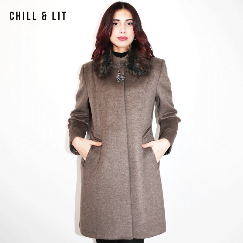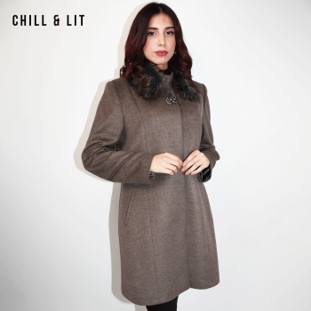 Manteau en Cachemire pour Femme avec Col en Fourrure Amovible, une Broche en Acier Inoxydable, deux poches, Fermeture à Boutons. Hyper Tendance cet Hiver. Le Mannequin Porte La Taille 44 et Mesure 1m78.
