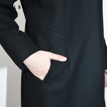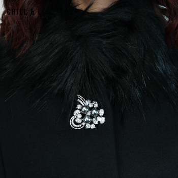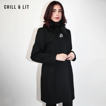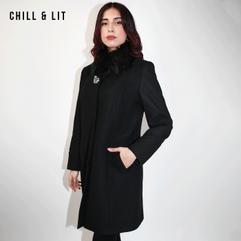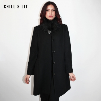 Manteau en Cachemire pour Femme avec Col en Fourrure Amovible, une Broche en Acier Inoxydable, deux poches, Fermeture à Boutons. Hyper Tendance cet Hiver. Le Mannequin Porte La Taille 44 et Mesure 1m78.