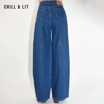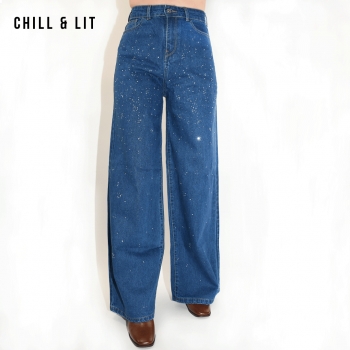 Pantalon Jean Femme Coupe Large avec Strass au style moderne et élégant, Taille Haute. Super Tendance en ce Moment. Le mannequin porte la taille 36. Le Mannequin Mesure:1m75.