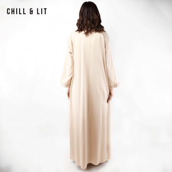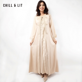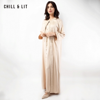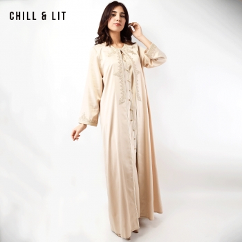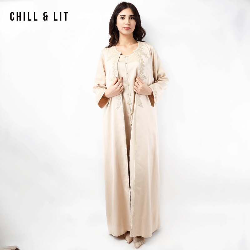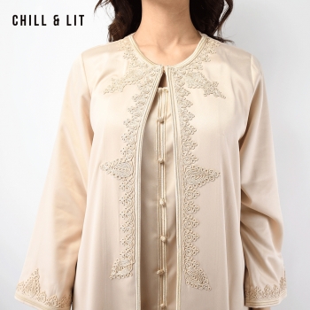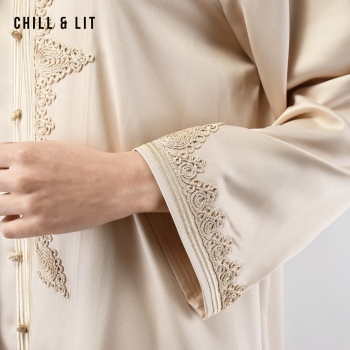 Un Caftan long au style chic Avec Broderie, Composé d’une robe élégante accompagnée d’un fond de robe Sans Manches, il offre un parfait équilibre entre confort et raffinement. Le mannequin porte la taille 3 .Le Mannequin Mesure:1m78