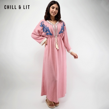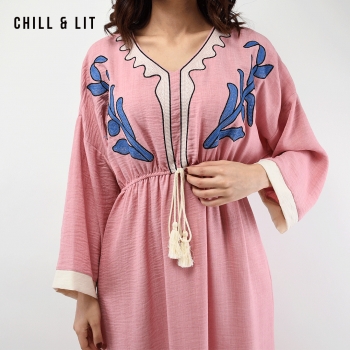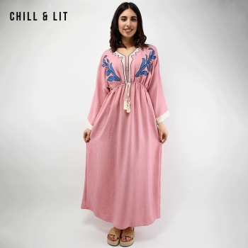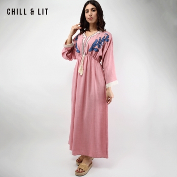 Robe Longue Avec Broderie Raffinée au Style Féminin, Manches larges trois-quarts offrent une silhouette fluide et un confort absolu. Sa taille élastiquée épouse délicatement les formes, mettant en valeur la silhouette avec finesse, Col V. élégante et confortable. Le mannequin porte la taille 3 .Le Mannequin Mesure:1m78.