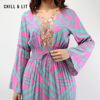 Robe Jebba Longue Raffinée au Style Féminin avec Manches Larges, Col V orné de Broderies. élégante et confortable. Le mannequin porte la taille S .Le Mannequin Mesure:1m78.