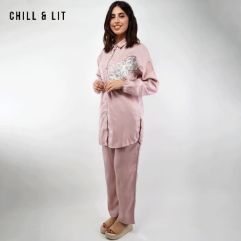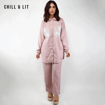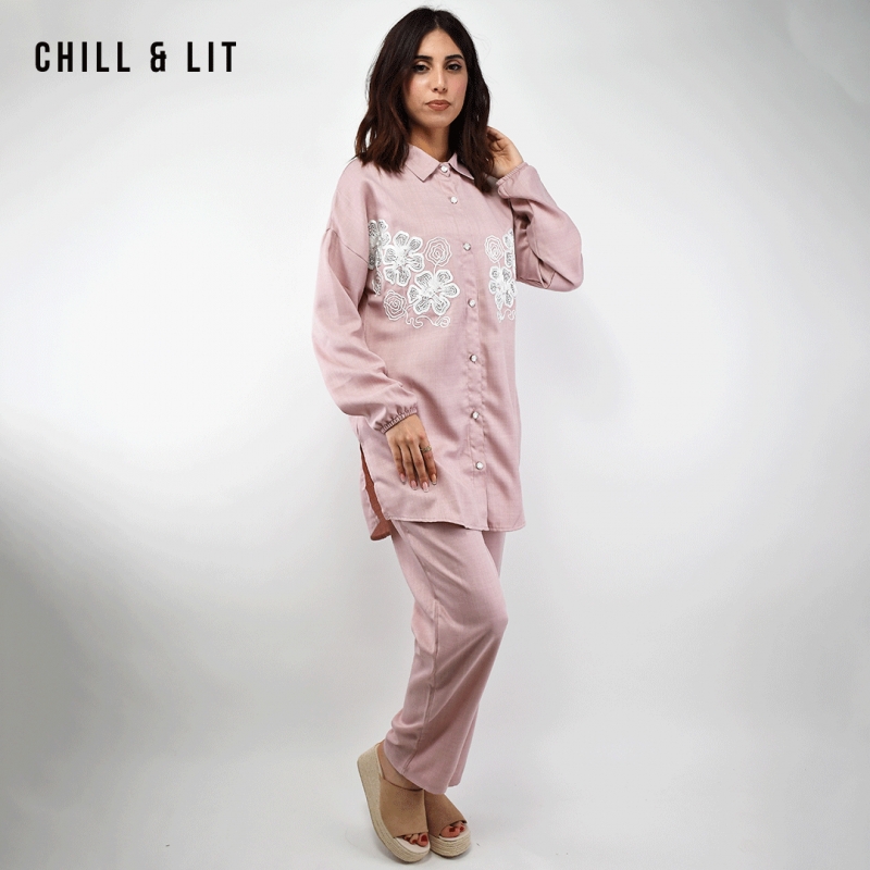 Ensemble pour Femme Chic et Confortable, Composé d’une Chemise longue avec broderie et fermeture boutonnée + un Pantalon Large Assorti avec Cordon de serrage à la taille. Ensemble offre une coupe fluide et moderne, idéale pour allier élégance et confort au quotidien.
