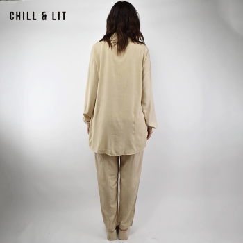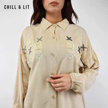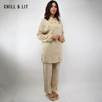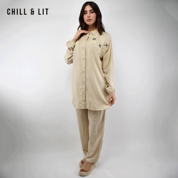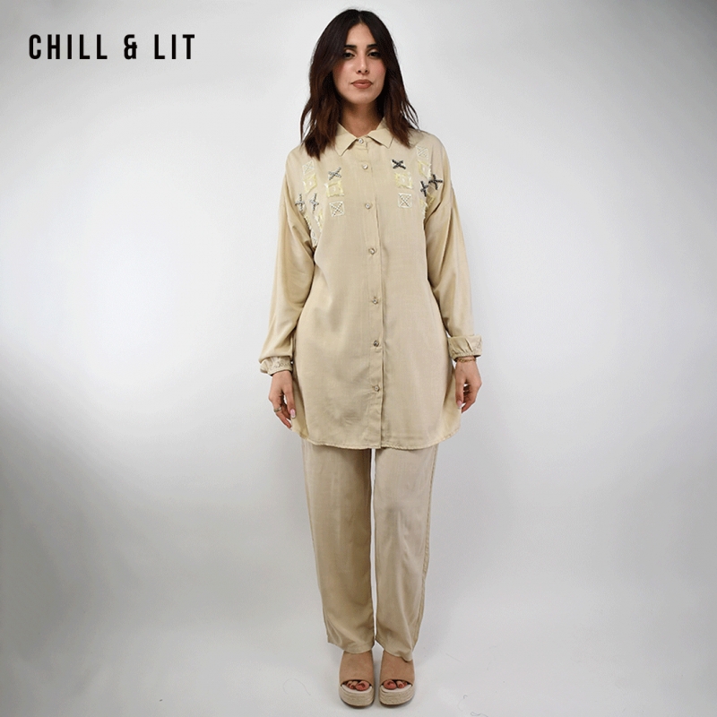 Ensemble pour Femme Chic et Confortable, Composé d’une Chemise longue avec broderies, Perles et fermeture boutonnée + un Pantalon Large Assorti avec Cordon de serrage à la taille. Ensemble offre une coupe fluide et moderne, idéale pour allier élégance et confort au quotidien.