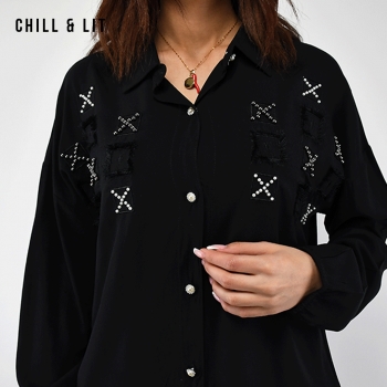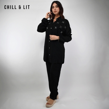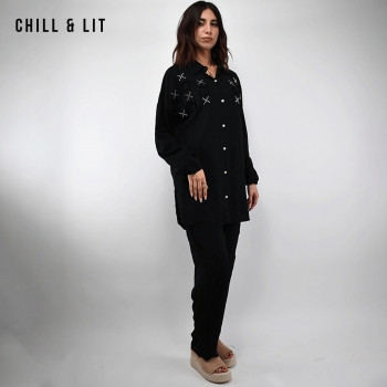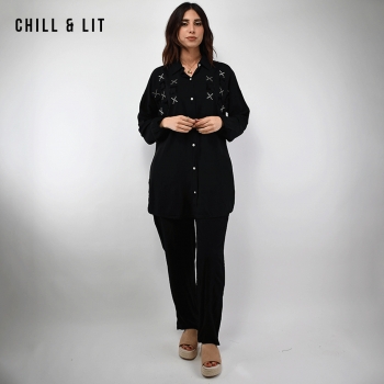 Ensemble pour Femme Chic et Confortable, Composé d’une Chemise longue avec broderies, Perles et fermeture boutonnée + un Pantalon Large Assorti avec Cordon de serrage à la taille. Ensemble offre une coupe fluide et moderne, idéale pour allier élégance et confort au quotidien.