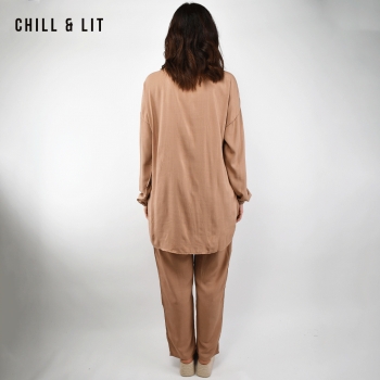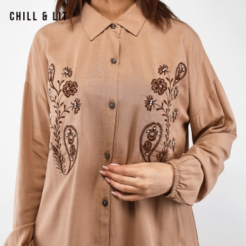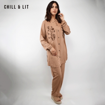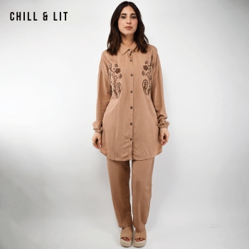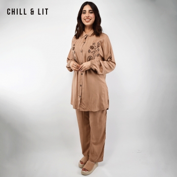 Ensemble pour Femme Chic et Confortable, Composé d’une Chemise longue avec broderies, Perles et fermeture boutonnée + un Pantalon Large Assorti avec Cordon de serrage à la taille. Ensemble offre une coupe fluide et moderne, idéale pour allier élégance et confort au quotidien.