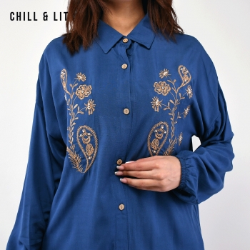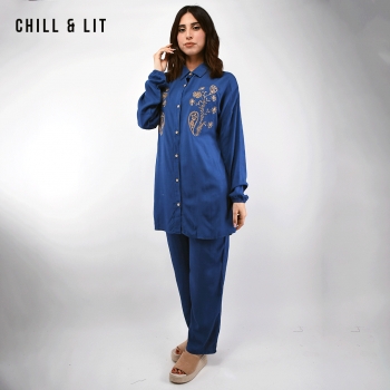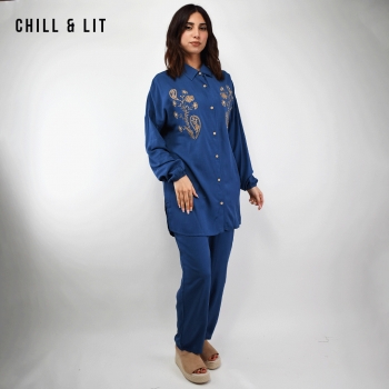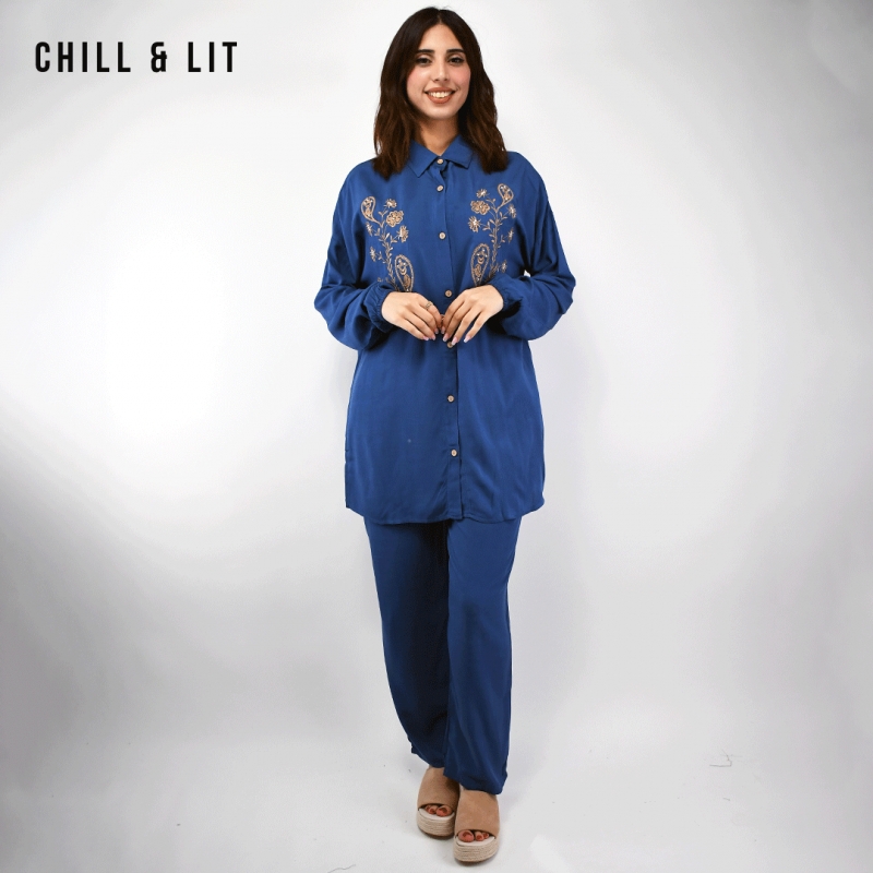 Ensemble pour Femme Chic et Confortable, Composé d’une Chemise longue avec broderies, Perles et fermeture boutonnée + un Pantalon Large Assorti avec Cordon de serrage à la taille. Ensemble offre une coupe fluide et moderne, idéale pour allier élégance et confort au quotidien.