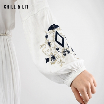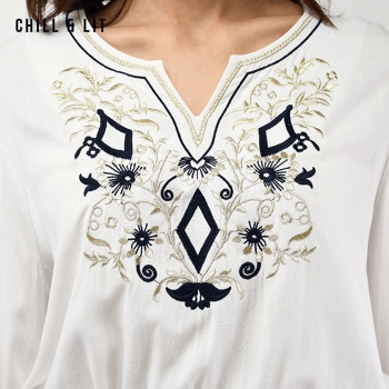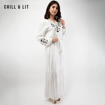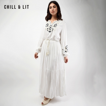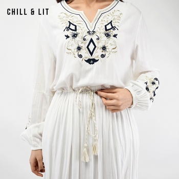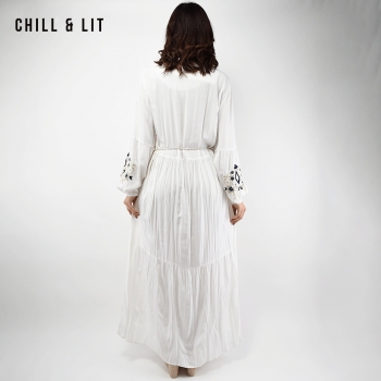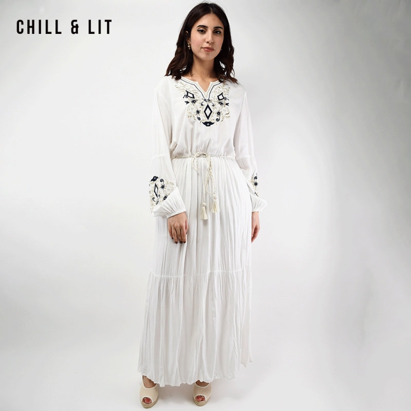 Robe Longue Brodée Manches Longues Hyper Tendances cet été. Le Mannequin Porte La Taille Standard.