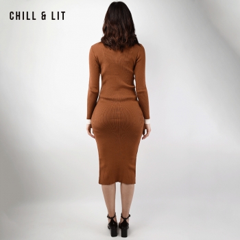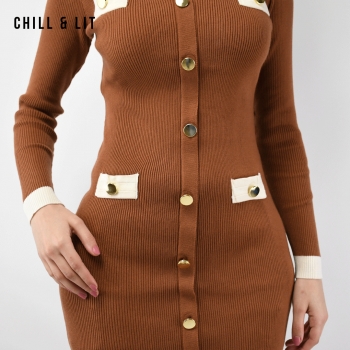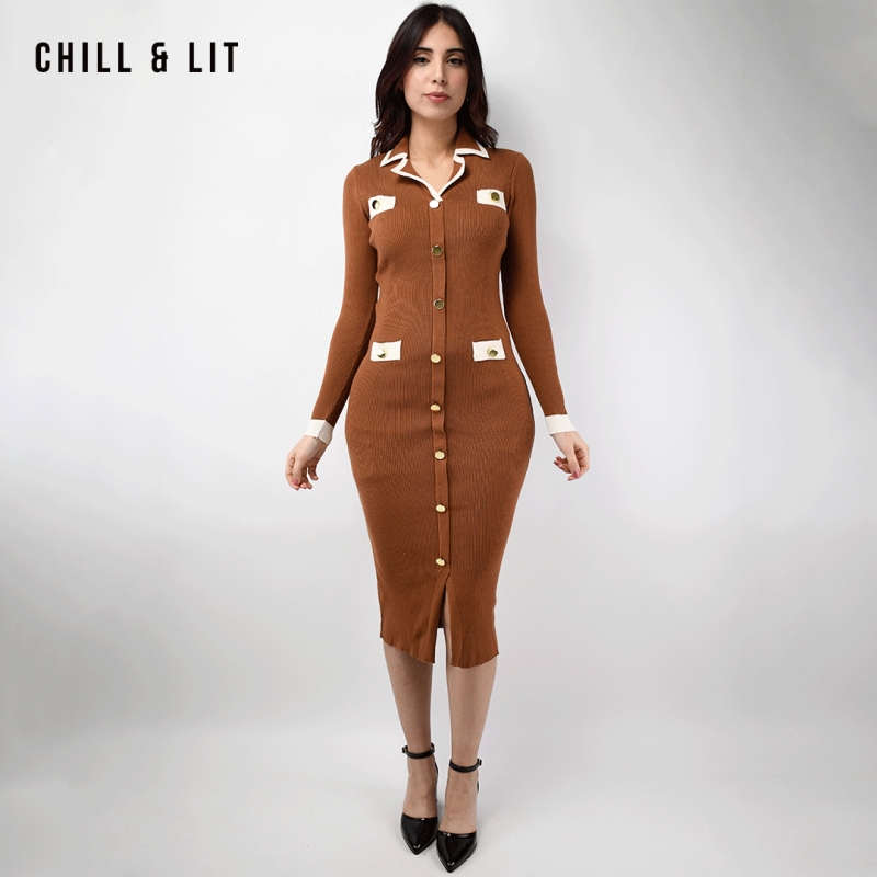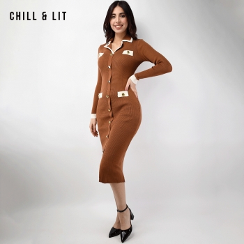 Robe Longue En Laine avec Effet de Cote de Style Old Money. Robe Ajustable Avec Manches Longues et Col Chemise avec Boutons Inoxydables Hyper Tendances Cet Hiver.