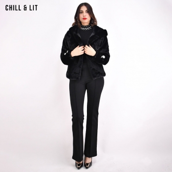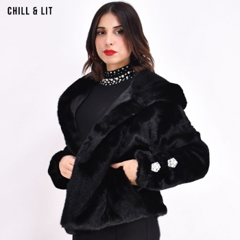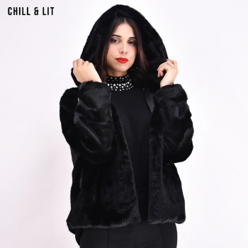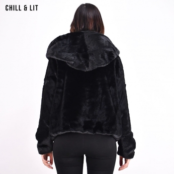 Veste Courte en Fourrure Femme Doublure en Cuir Avec Fermeture en Crochet, Capuche Hyper Tendance cet Hiver. Le Mannequin Porte La Taille S et Mesure 1m78.