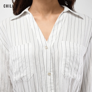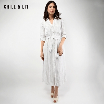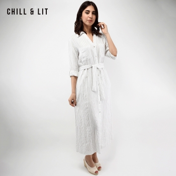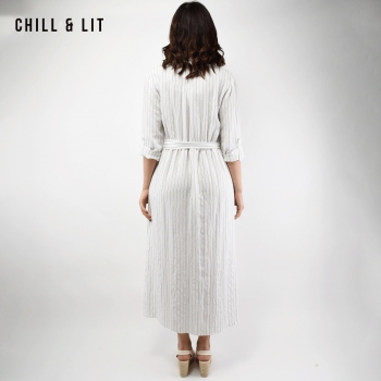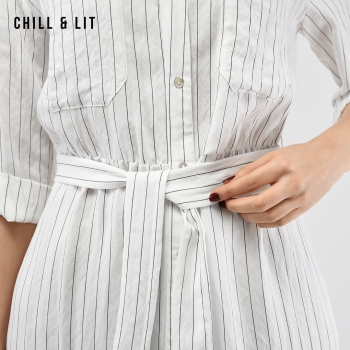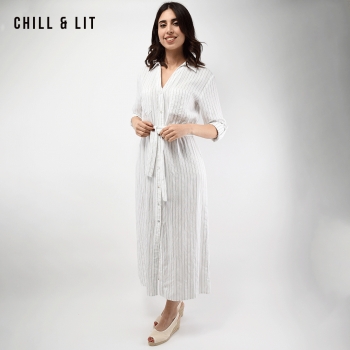 Robe Chemise Rayée Élégante et intemporelle, cette robe chemise à rayures fines bleues allonge la silhouette. Boutonnée sur toute la longueur et ceinturée à la taille, elle est idéale pour un look chic et confortable au quotidien. Le Mannequin Porte La Taille 38.