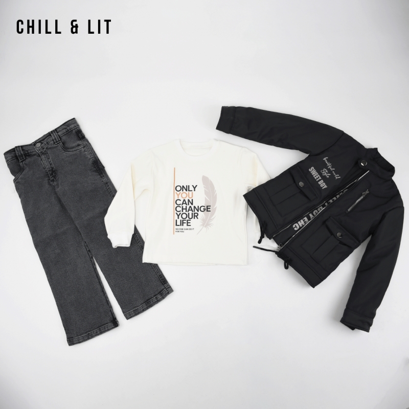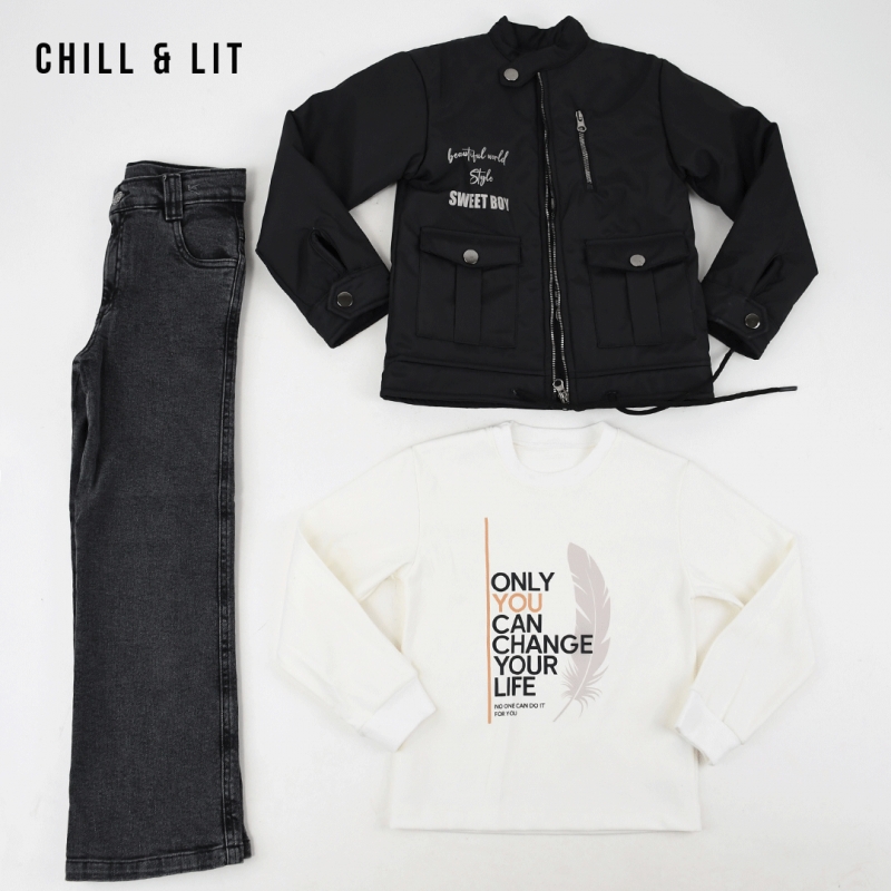 Ensemble Garçonnet 3 Pcs Veste avec deux poches à l'avant + Pull à Manches Longues + Pantalon . Très Tendances . L'ensemble sur La Photo est La taille 4 ANS.