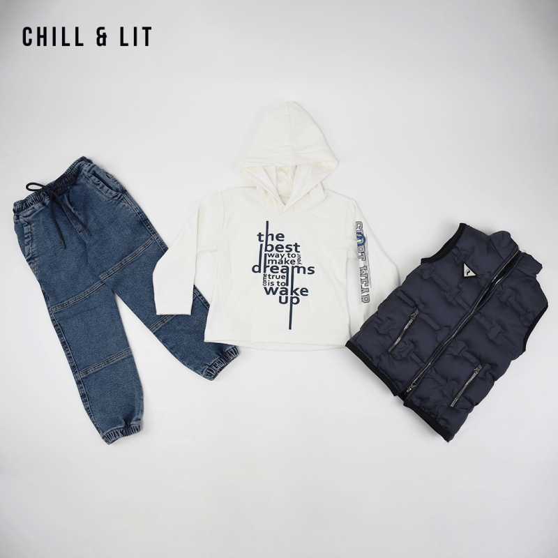 Ensemble Garçonnet 3 Pcs Doudoune sans Manches avec deux poches à l'avant + Capuche + Pantalon . Très Tendances . L'ensemble sur La Photo est La taille 4ans.